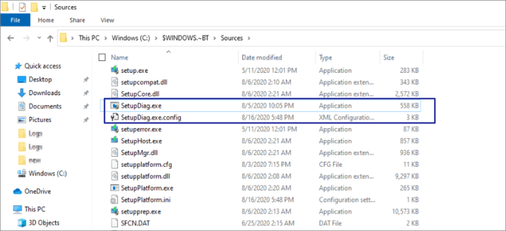 Starting Windows 10, version 2004, SetupDiag is included in Windows Setup. SetupDiag is extracted to %SystemDrive%$Windows.~bt\Sources\ directory along with other Windows setup files. SetupDiag searches logs files from following location: