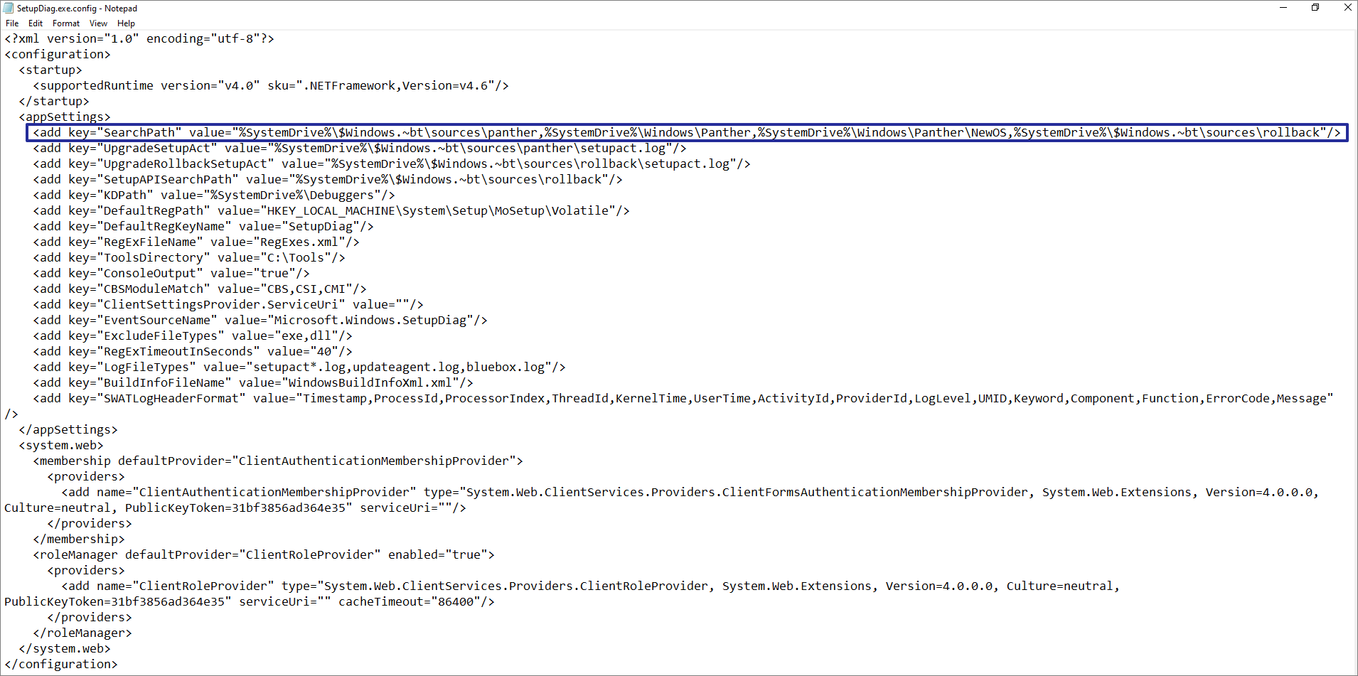 These location are hardcoded in SetupDiag configuration file SetupDiag.exe.config which is also stored in the same location as SetupDiag.exe i.e. %SystemDrive%$Windows.~bt\Sources\